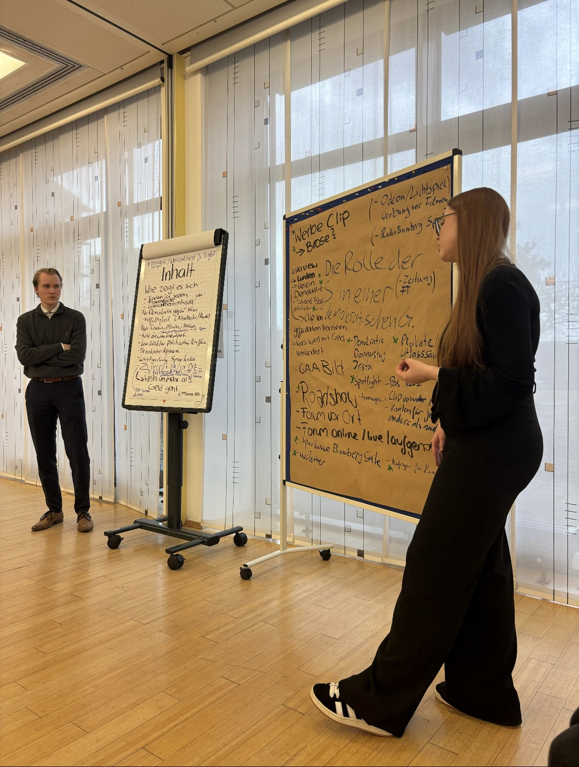 Wir, das Lehrjahr 2023 der Sparkasse Bamberg, wollten unser Jubiläum nicht nur feiern, sondern auch nachdenken, reflektieren und sichtbar machen, wie wichtig unsere Sparkasse für das gesellschaftliche Miteinander wirklich ist. Denn Demokratie ist nichts Selbstverständliches. Sie lebt davon, dass Menschen mitmachen, Verantwortung übernehmen und sich für andere einsetzen.