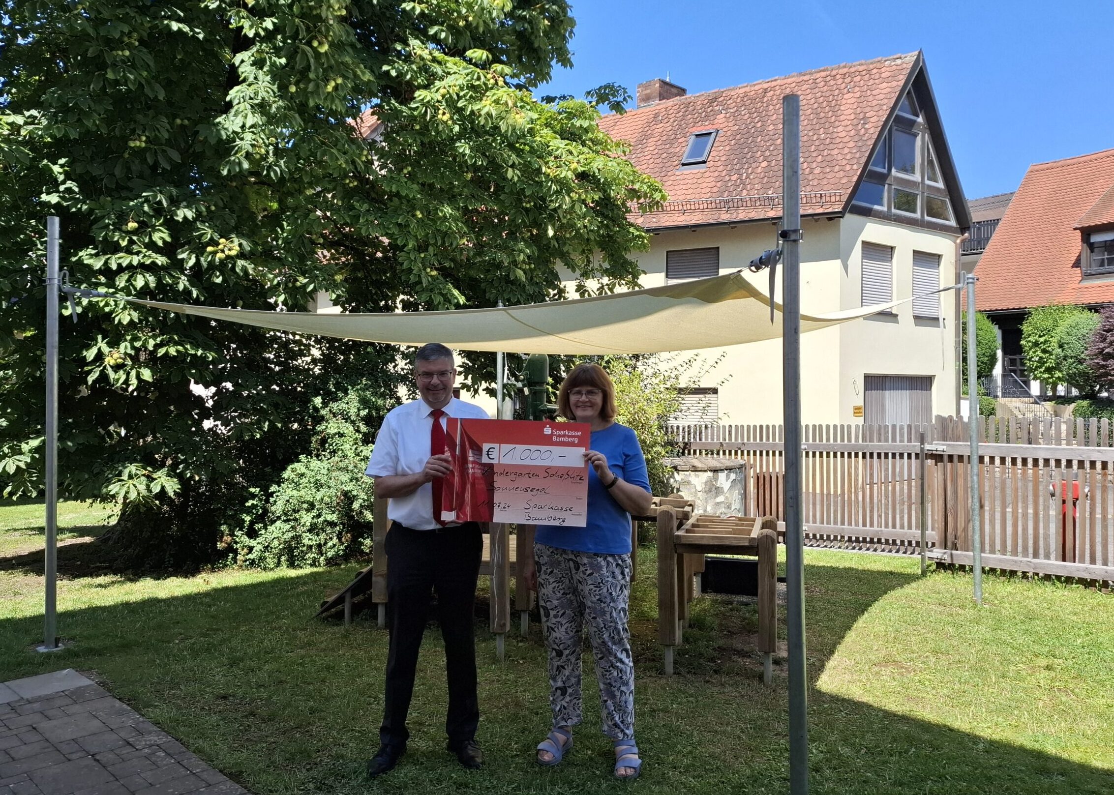 - Der Kindergarten „Schäätzer Zwoggäla“ aus Scheßlitz freut sich über 1.000 Euro für ein neues Sonnensegel, überreicht von unserem Kollegen Christian Kaufmann.